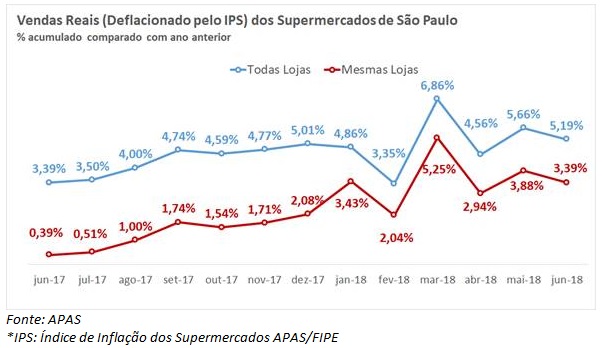 O faturamento real dos supermercados no estado de São Paulo (deflacionado pelo IPS/FIPE e calculado pela Associação Paulista de Supermercados), no conceito de todas as lojas – que considera todas as unidades criadas no período pesquisado –, apresentou alta de 2,78% no mês de junho em relação ao mesmo período do ano passado. Este resultado fez o acumulado de 2018 chegar a 5,19% de crescimento em relação a 2017.