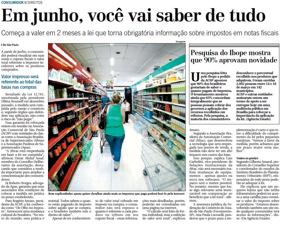 A partir de junho, o consumidor poderá visualizar em suas notas e cupons fi scais o valor total referente a impostos incidentes sobre os produtos comprados. Resultado da Lei 12.741, sancionada pela presidenta Dilma Rousseff em dezembro, a medida será cumprida pelo varejo e comércio e, segundo órgãos que defendem sua aplicação, ela não corre o risco de ‘não pegar’.