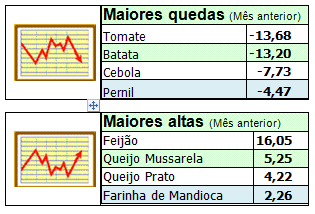 As maiores quedas de preço no mês de junho foram registradas em produtos como: tomate, batata, cebola e pernil. Já as maiores altas foram nos itens: feijão, queijo musssarela, queijo prato e farinha de mandioca. Confira a tabela abaixo: