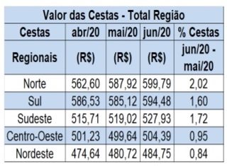 Em junho, o *Abrasmercado registrou alta de 1,46% na comparação com maio, passando de R$ 534,48 para R$ 542,27. No acumulado dos 12 meses (junho2019/junho2020), o valor da cesta subiu 11,33%. As maiores quedas nos preços foram registradas nos produtos: tomate, -17,02%, frango congelado, -3,04%, extrato de tomate, -2,63%, cebola, -2,39%, e ovo -2,34%. As maiores altas foram nos itens: queijo muçarela, 10,93%, feijão, 9,44%, carne dianteiro (acém, cupim, paleta, músculo, entre outras.), 5,12%, queijo prata, 5,03%, e arroz, 4,01%.