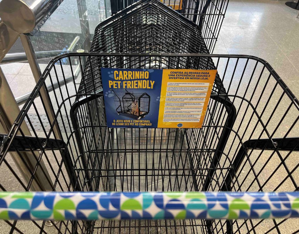 Nas lojas ‘Pet Friendly’ do Prezunic, os clientes contam com carrinhos de compras adaptados para receber seus bichinhos, nos quais estão fixados avisos contendo as normas estabelecidas pelo município para a presença de cães e gatos em supermercados.
