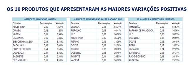 Veja baixo os 10 produtos que apresentaram as maiores variações negativas e positivas neste mês, no acumulado do ano e em 12 meses.